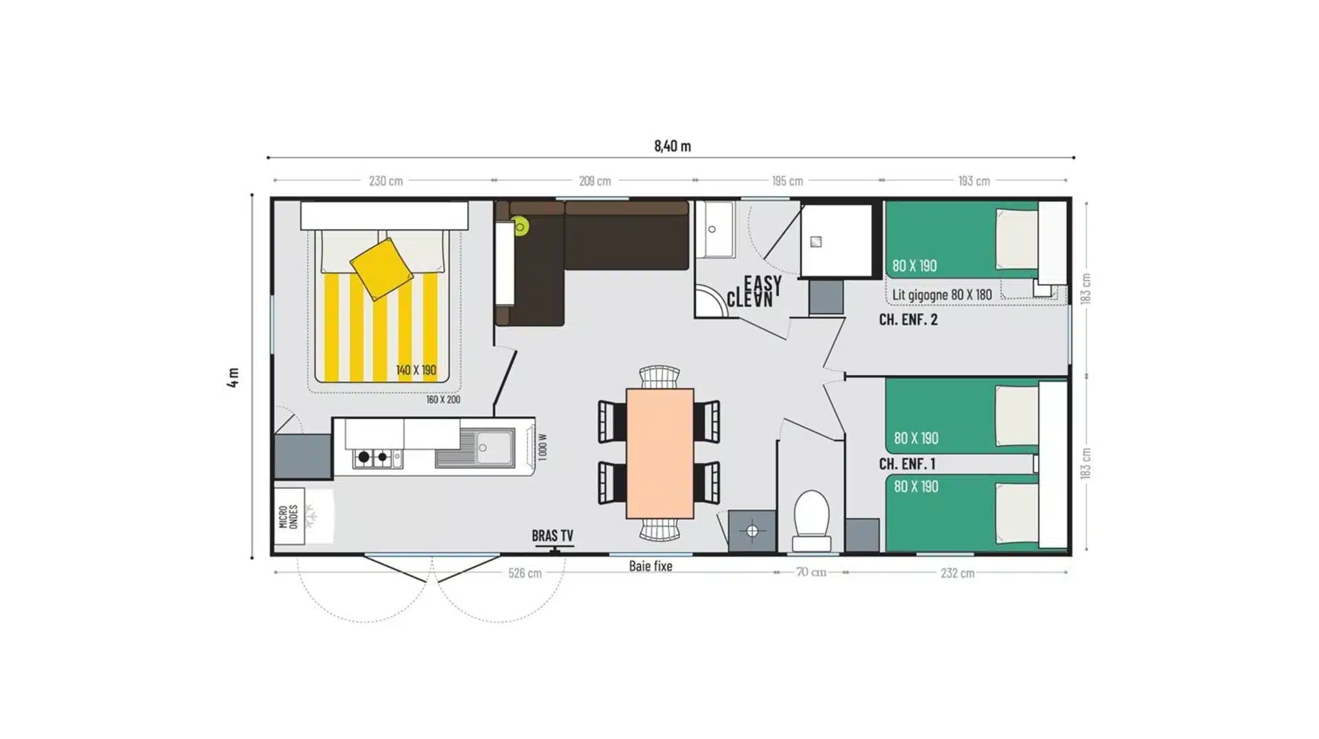 - Two bedrooms with 2 single beds (80 x 190).